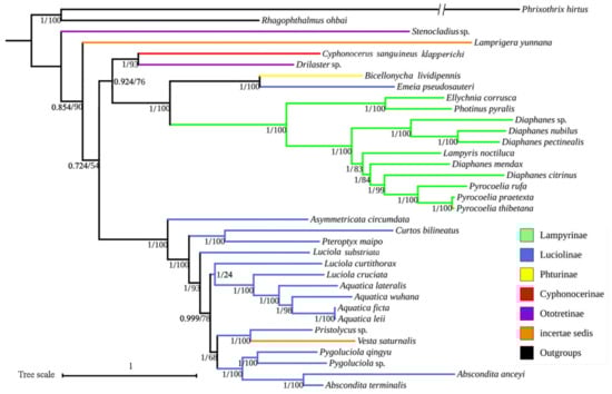 Furthermore, our analyses indicated that Stenocladius was most probably the basal lineage of Lampyridae, which correlated with that of Li et al. [97]. In addition, Cyphonocerus (Cyphonocerinae) was recovered more closely related to Drilaster, which is in agreement with that of Martin et al. [20]. The clade of Drilaster and Cyphonocerus seemed more closely related to Lampyrinae but Luciolinae, which is in agreement with Suzuki [21], but against those results of Martin et al. [20] or Chen et al. [2].