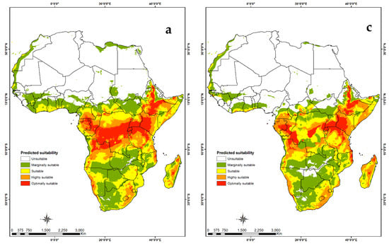 Nineteen bioclimatic variables downloaded from WorldClim (www.worldclim.org) (accessed on 15 April 2021) were considered for the study. We obtained current climate data for the period 1970–2000 at 30 arc seconds longitude/latitude degree spatial resolution (approximately 1 km at the equator). For future analysis, the downscaled and calibrated horizon 2050 IPPC (CMIP5) of climate projection bioclimatic variables were extracted from HadGEM2-ES global climate model (GCM) representing representative concentration pathways (RCP8.5) for future climate scenarios set by the intergovernmental panel on climate change (IPCC) [53]. RCP8.5 scenario predicts the mean global temperature increase projections of up to 3.7 °C. A collinearity test was conducted on the 19 bioclimatic variables to reduce collinearity between variables, to avoid overfitting of the model and variable inflation [54]. The variance inflation factor (VIF) test was used to assess the correlation between variables. The “vifcor” function in R software version 3.0.1 was used to run the VIF test [55]. Six bioclimatic variables, namely Bio2 (mean diurnal temperature range), Bio3 (Isothermality), Bio5 (max temp of warmest month), Bio13 (precipitation of wettest month), Bio15 (precipitation seasonality), and Bio19 (precipitation of coldest quarter) were selected for the B. alcinoe species analysis, while seven bioclimatic variables namely, Bio2, Bio4 (temperature seasonality), Bio8 (mean temperature of wettest quarter), Bio13, Bio15, Bio18 (precipitation of warmest quarter), and Bio19 were selected for the C. forda species analysis using a cutoff of |r2| > 0.7. Aside from the spatial correlation, the ecological relevance of the variables was also considered.