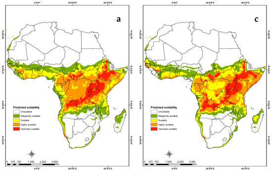 Predictive suitability map of the geographic distribution of Cirina forda. (a) Suitability map generated by the MaxEnt algorithm under current climate scenario; (b) suitability map generated by the GARP algorithm under current climatic scenario; (c) suitability map generated by MaxEnt algorithm under future climatic scenarios and (d) suitability map generated by the GARP algorithm under future climatic scenarios.