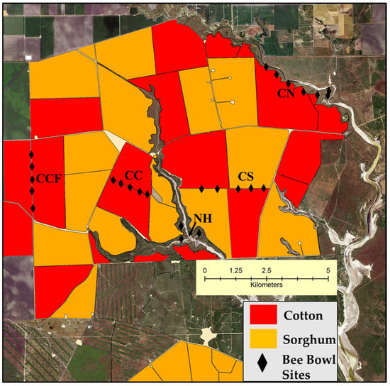 Field sizes and shapes ranged from 200 to 600 hectares and varied from high curvilinearity with large edge-to-area ratios to simple polygons with low edge-to-area ratios (Figure 1). This allowed for bee collections to be taken at five different cotton–crop or cotton–semi natural habitat interfaces, along with a comparison with a natural habitat alone. The interface was defined as the margin between two crop fields or crop fields and semi-natural habitats. Fields were separated by a narrow dirt road large enough for farm equipment to pass through. Interfaces were selected from multiple fields of a large farm operation that were available to the study. Assignment of interfaces was random within the constraint of the arrangement of fields and non-crop vegetation allowed by farm management (Figure 1). Bee collections occurred in 2017 and 2018, with sample fields changing between the years and specific sampling locations (sites) of the selected interfaces of these fields changing within years. Three interfaces were considered in 2017: A cotton field grown next to another cotton field (designated as cotton–cotton, CC in graphics), cotton grown next to sorghum (designated as cotton–sorghum, CS in graphics), and cotton grown next to semi-natural habitat (designated as cotton–natural habitat, CN in graphics). In 2018, in addition to these three interfaces, two more treatments were considered. These were cotton grown next to another cotton field more than 1 km away from semi-natural habitat (designated as cotton–cotton-far, CCF in graphics) and a natural habitat alone comparison was at least 200 m from a cotton field edge (designated as natural habitat, NH in graphics).