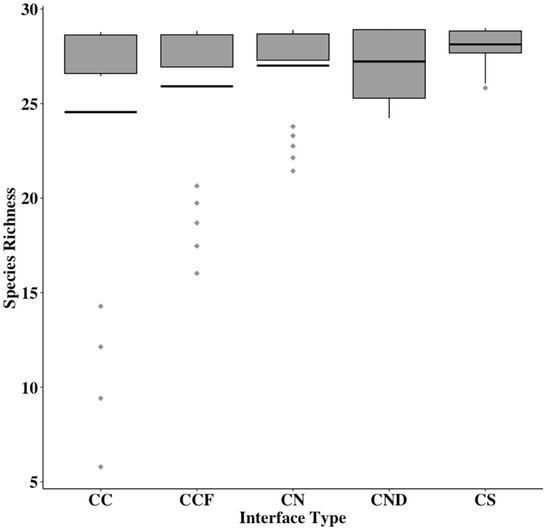 Species richness calculated from bee-bowl collections in both years (2017 and 2018 combined) shown as boxplots across interfaces from bee-bowl collections in a large-scale cotton agroecosystem. Interface types were sites between a cotton field and another cotton field (CC), a sorghum field (CS), semi-natural habitat (CN), another cotton field 1 km away from semi-natural habitat (CCF) and semi-natural habitat alone (NH). The solid black bar gives treatment mean, boxes give the 1st and 3rd quartiles, and diamonds show outliers.