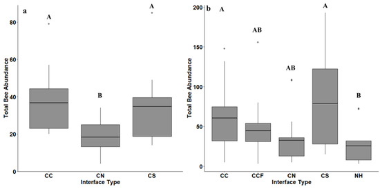 When investigating the effect of interfaces on the total amount of native bees collected in both 2017 (F = 4.26; df = 2, 27; p = 0.02) and 2018 (F = 3.75; df = 4, 69; p = 0.008), more native bees were collected at crop–crop interfaces. In 2017, more native bees were collected on average at the interface of cotton–sorghum and cotton–cotton compared to the interface of a cotton field-semi-natural habitat (Figure 4a). In 2018, more native bees on average were collected at the interface of a cotton–sorghum, and cotton–cotton, compared to cotton–natural habitat alone (Figure 4b). The interfaces of a cotton–cotton-far and natural habitat were intermediate in abundances (Figure 4b).