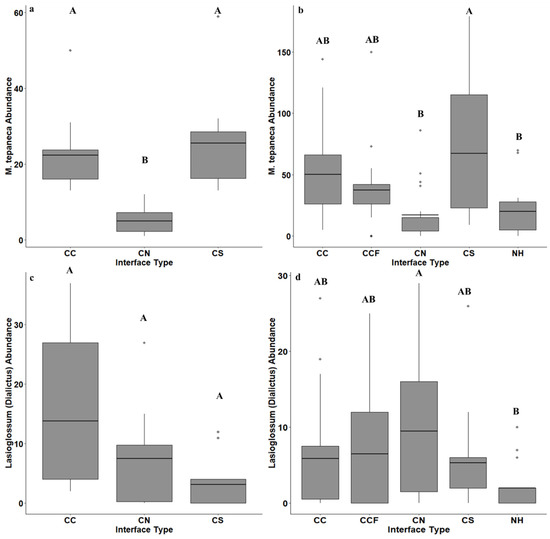 Interface type had a significant effect on the abundance of 12 Lasioglossum (Dialictus) species in 2018 (F = 4.66; df = 4, 69; p = 0.002) but not 2017 (F = 3.12; df = 2, 27; p = 0.06) (Figure 5c,d). In 2018, more Lasioglossum (Dialictus) spp. were caught on average at the cotton and semi-natural habitat interface compared to the natural habitat alone. The other interfaces had an intermediate number of Dialictus spp. collected (Figure 5d).