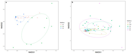 A Non-metric multidimensional scaling (NMDS) of Bray–Curtis similarity data of native bee communities in 2017 (a) and 2018 (b) across crop and semi-natural interfaces in a large-scale cotton agroecosystem. Each point is representative of a site placed according to their similarities with other sites, and ellipses representing the variance of the number of species within those sites. Widths of ellipses indicating the bee community similarity within sites at a given interface are greater than the similarities between the sites at different interfaces.