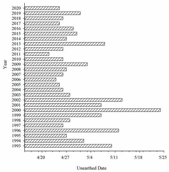 Temperature can affect the distribution of Colorado potato beetles [47], Qapqal County is located in the northern part of Xinjiang, belongs to the temperate continental climate, is a warm and dry regions—suitable for Colorado potato beetles growth [8,48]. Therefore, in this study, the emerged data of Colorado potato beetles and meteorological data from April to May were selected in Qapqal County to study the growth and development of Colorado potato beetles by short-term low temperature treatment. We found that Colorado potato beetles emerged from late April to early May in Qaqal County, it is similar to the observations of Li [49]. The temperature analysis of Qaqal County was found, during the time span of 1993 to 2020, the mean temperature in Qapqal County was 15.88 °C (Figure 5), the minimum temperature is 2.2 °C, this temperature deviates far below the normal temperature., and the mean daily temperature for these 18 years was below 12 °C, an average daily temperature below 12 °C for three consecutive days occurred in about seven years (Figure 6), consistent with the phenomenon of cold spells in late spring [36]. Tuerxn [4] found that when the temperature reached above 8 °C in April and the effective accumulated temperature reached 50 days, the adults began to emerge. If cold spells in late spring occurred before the Colorado potato beetles emerged, the number of emerged adults of the Colorado potato beetles would be decreased [50] (The number of Colorado potato beetles emerging was positively correlated with the emergence time in Qapqal County), which might reduce the damage of Colorado potato beetles.