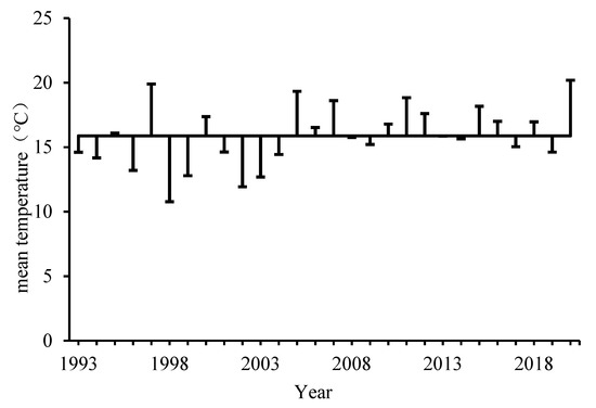 The climate data used in this study were obtained from the Web site of China Meteorological Data Network (https://data.cma.cn, accessed on 15 October 2019). The daily climate data of Qapqal County in Xinjiang from 1993 to 2020 were used. The average temperature from 20 April to 5 May in each year was used as the study temperature (The Colorado potato beetle emerges from late April to early May [8]. For this study, we counted the number of days when the daily average temperature was below 12 °C, the number of times the daily average temperature was below 12 °C for 3 consecutive days, and the annual average temperature.)