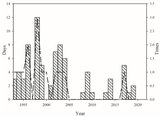 Temperatures below 12 °C in Qapqal County from 1993 to 2020. The histogram represents the number of days per year when the average daily temperature was lower than 12 °C. The line chart shows the number of times that the average daily temperature was below 12 °C for 3 consecutive days.