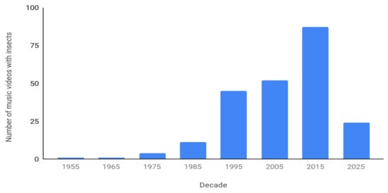 Given the recent recognition of the global decline in insect populations [7], it is critical that we understand how humans perceive insects and perhaps how we leverage that knowledge to conserve insects [8]. A multipronged approach examining the concept from diverse perspectives is likely to lead to a broad understanding. Media that are relatively new and appealing to youth may have a greater impact than older forms. The music video, though appearing sparingly in a variety of venues for decades previously, seemed to burst onto the scene in the United States of America on 1 August 1981, when the cable television channel MTV launched. From the beginning, the channel was steeped in insectile offerings. The first video shown was “Video Killed the Radio Star” by The Buggles, the band’s name being an insect pun. One of the early important acts was Adam and the Ants. Although MTV’s programming is now more diverse, the music video changed the music industry and American popular culture. The music video, as a brief bite of images and sound, is the perfect form for the modern short attention span. It entertains the viewer while promoting the artist and their music. Hence, the imagery used in it is expected to be carefully chosen. This study examines the use of insects in music video, a relatively recent popular medium, on the premise that the insects that appear and the manner in which they are used will reflect current human perceptions and attitudes toward insects.