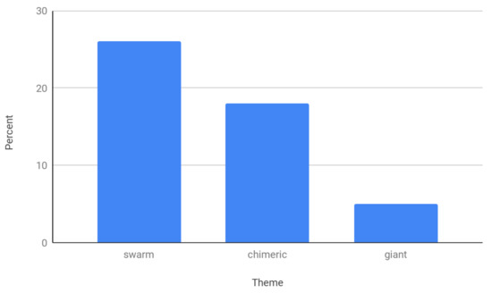 The relative appearance of three common themes in music videos: swarms, chimeric human/insect hybrids, and giant insects.