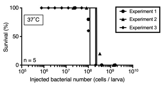 Silkworm models of infection by various microorganisms have been established [15]. The body temperature of silkworms, which can be regulated by changing the rearing temperature, is important for bacterial pathogenicity against silkworms [15]. In the case of Aspergillus fumigatus and dermatophytes, silkworms do not die at 37 °C by depending on their infection [24,28]. Therefore, it is important to consider the temperature at which the experiment is performed for each pathogen. C. acnes grows at approximately 32 °C on the skin and 37 °C in the human body. We examined the rearing temperatures that caused death in C. acnes-infected silkworms. Silkworms injected with C. acnes (1.6 × 109 cells) reared at 37 °C after injection died within 40 h, whereas infected silkworms reared at 32 °C survived longer (Figure 1). The time required for half of the infected silkworms to die (LT50) was 48 h for silkworms reared at 32 °C and 27 h for those reared at 37 °C (Figure 1). The LD50 value, which is the bacterial number required to kill half of the silkworms, was 1–3 × 108 cells when infected silkworms were reared at 37 °C (Figure 2). These results suggest that rearing C. acnes-infected silkworms at 37 °C decreased survival and that the pathogenicity of C. acnes can be quantitatively assessed based on the LD50 value.
