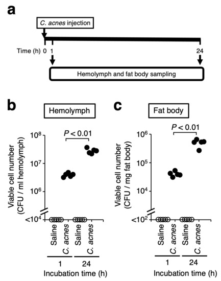 Fat body isolation was performed as previously described [26]. Silkworms were placed on ice for 15 min. The fat body was isolated from the dorsolateral region of each silkworm and rinsed in saline. The wet weight of the fat body was measured. The fat body was homogenized in 1 mL of saline, and the lysate was obtained. The lysate was 102 or 103-diluted with saline, and a 100 μL aliquot was spread on GAM agar plates. The number of colonies was counted after incubation at 37 °C for 3 days under anaerobic conditions. The viable cell number of C. acnes per wet weight of the fat body was determined.