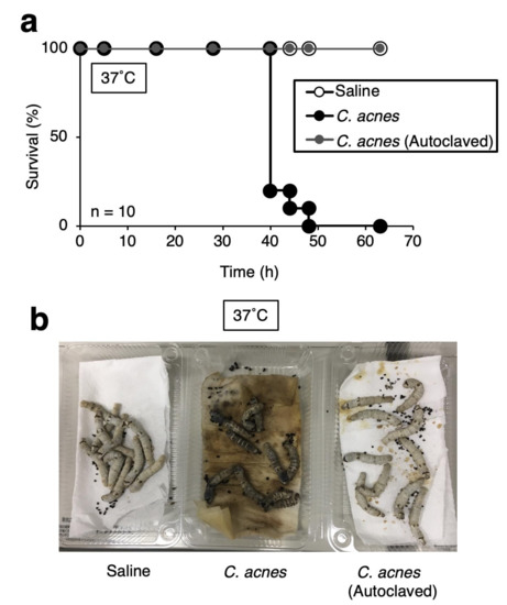Because C. acnes causes bloodstream infections, we selected injection the C. acnes into the hemolymph of the silkworms. C. acnes-infected silkworms under the rearing condition at 37 °C were more sensitive than that at 32 °C. We assumed that this is due to two factors: the effect of high-temperature stress on the silkworm and the optimal temperature at which the pathogens have high virulence. The silkworms injected with the autoclaved C. acnes cells seem to be unhealthy compared with those in the saline group (Figure 4b). We assumed the reason is that the hemolymph of silkworms was melanized and the melanization might affect the silkworm condition. The C. acnes cells grow in the hemolymph and on the tissues of the silkworms. C. acnes use the nutrition of the silkworms and might cause toxicity to the tissues. The melanization of the hemolymph of silkworms caused by C. acnes might affect tissue toxicity. We assumed that the silkworms infected with C. acnes cause sepsis by the proliferation of C. acnes cells in the hemolymph and on tissues of the silkworms.