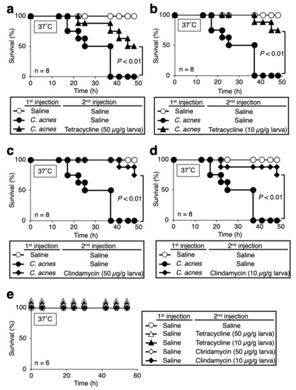 Effect of antibacterial drugs in silkworms infected by C. acnes. Silkworms were injected with saline (50 µL) or C. acnes cell suspension (3.6 × 108 cells/50 µL), and then with tetracycline (50 µg/g larva) (a), tetracycline (10 µg/g larva) (b), clindamycin (50 µg/g larva) (c), or clindamycin (10 µg/g larva) (d). The number of surviving silkworms under incubation at 37 °C was measured for 48 h. Statistically significant differences between groups were evaluated using a log-rank test. n = 8/group. (e) Silkworms were injected with saline (50 µL), and then with tetracycline (50 µg/g larva), tetracycline (10 µg/g larva), clindamycin (50 µg/g larva), or clindamycin (10 µg/g larva). The number of surviving silkworms under incubation at 37 °C was measured for 54 h. n = 6/group.