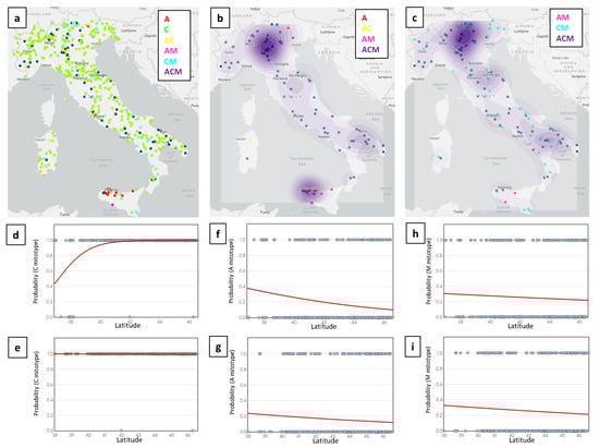 (a) Distribution of all analyzed honey samples in Italy with information on the mitotype patterns indicated with dots in the map with the same colors of the legend. (b) Density map of the analyzed samples carrying the A lineage. (c) Density map of the analyzed samples carrying the M lineage. (d–i) Logistic regression curves showing relationships between the occurrence of lineage C (d,e), including all Italian regions, i.e., the peninsula, Sardinia and Sicily (d); or only the peninsula data (e); lineage A (f,g), with all Italian regions (f); or only the peninsula data (g); lineage M (h,i), with all Italian regions (h); or only the peninsula data (i).