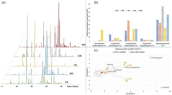 The chromatograms of the VOC profiles of different basils essential oils (LB; lemon basil (O. citriodorum), RB; red holy basil (O. sanctum var. Rama), TB; Thai basil (O. basilicum var. thyrsiflorum), TrB; tree basil (O. gratissimum), and WB; white holy basil (O. sanctum var. Shyama)) with the detailed analysis of the chemical compositions as illustrated in Table 2 (a), their relative percentage composition of volatile types (b), and a biplot diagram illustrating the relationships among the volatiles components with five basil types (c).