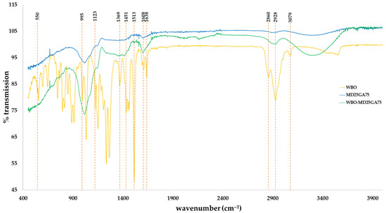 FTIR spectra of white holy basil oil (WBO), the wall material (MD25GA75), and white holy basil oil-loaded product (WBO-MD25GA75).