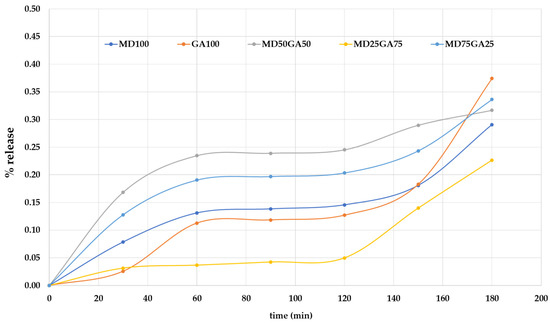 The volatile release characteristic of encapsulated products was given as in Figure 3. The results were reported according to the percentage of weight loss after exposure in the ambient condition. The releasing of all capsules during the first 120 min was initially subtle. However, after 120 min, capsules containing high GA (GA100 and MD25GA75) gave a remarkable increase in the release. In contrast, high doses of MD-containing capsules remained relatively stable.