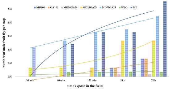 Our field study was conducted during the sunlight to test the ability of the product as an attractant and the efficiency compared to the methyl eugenol. The temporal pattern of the mating behaviour of fruit flies: courtship episodes of the flies were usually between 0–9 h, and the striking peak of the activity was before noon [69,70]. The decision of female flies to mate with male fruit flies depends on long-range attraction signals, willingness to copulate, and male-male competition [71]. On the other hand, males decide to mate upon their libido and external stimuli, such as methyl eugenol [72]. Courtship usually takes place on fruits and fruit trees, and the estimated male success rate of mating is only around 0.6 per female per day [70]. Without mechanical traps, delivery of methyl eugenol fumigation enhances the mating success of B. carambolae and B. dorsalis males [73], which is not recommended for the non-sterile insect approach. Therefore, it is crucial to maintain the release of VOCs with semiochemical properties during the courtship episodes to be successful in the mechanical trap. Our finding demonstrated that paste encapsulation with MD combined with GA could maintain the release rate of the essential oil.