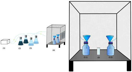 The attractiveness experiment using the two bottle-trap (two-choice olfactometer): (1) electric air pump, (2) activated charcoal flasks, (3) distilled water flasks, (4) experimental cage, (5) insects releasing point, and (5.1) and (5.2) bottle traps.
