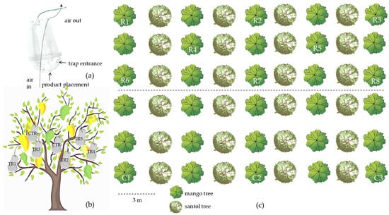 Field study of the Oriental fruit fly traps with encapsulated products during mango var. nam dok mai harvesting season. (a) Trap and (b) Trap hanging inside the canopy; TR1 = MD100, TR2 = GA100, TR3 = MD50GA50, TR4 = MD75GA25, TR5 = MD25GA75, CTR+ = white holy basil essential oil, and CTR- = no test solution (c) Experimental arrangement; R1–R8 as trap replications 1–8, and C1–C3 as traps with the commercial fruit fly attractant 1–3.