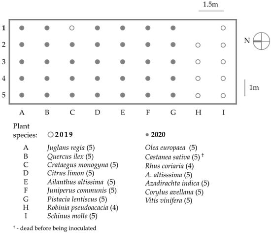 Map of the garden plot setup for target, Ailanthus altissima and nontarget plants inoculated with Aculus mosoniensis during host-specificity tests performed in 2019 and 2020, respectively. The number of replicates for each species is reported in brackets.