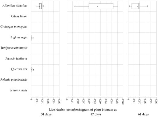Number of live Aculus mosoniensis per gram of plant biomass collected from the plant species tested at 34, 47, and 61 days post-inoculation, respectively, in the field experiment performed 2019.The boxes represent the first to third quartile range with the median indicated by a line across the box and the mean by crosses. Bars flanked by different letters differ significantly at p = 0.05.