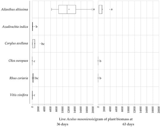 Number of live Aculus mosoniensis per gram of plant biomass collected from the plant species tested at 36 and 63 days post-inoculation, respectively, in the field experiment performed 2020. The boxes represent the first to third quartile range with the median indicated by a line across the box, and the mean by crosses. Outliers are indicated by empty dot. Bars flanked by different letters differ significantly at p = 0.05.