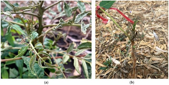 Symptoms of Aculus mosoniensis on Ailanthus altissima: (a) leaves strongly deformed 47 days post-inoculation in 2019; (b) dried and necrotic apical part 63 days after inoculation in 2020.
