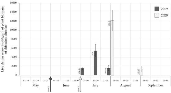 Number of live Aculus mosoniensis per gram of plant biomass collected from Ailanthus altissima (mean ± SE) through the season in field experiments performed in 2019 and 2020, respectively. The arrows represent the inoculation day (inoc.), whereas days after inoculation are indicated in brackets flanking the bars (34, 47 and 61 days in 2019; and 36 and 63 days in 2020).
