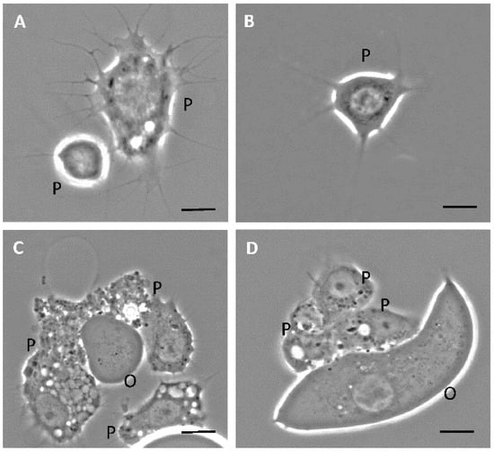 (A–D) Phase contrast microscopy of fifth instar nymphs hemocytes of Dipetalogaster maxima. P, plasmatocyte; O, oenocyte. Bars: 10 μm.