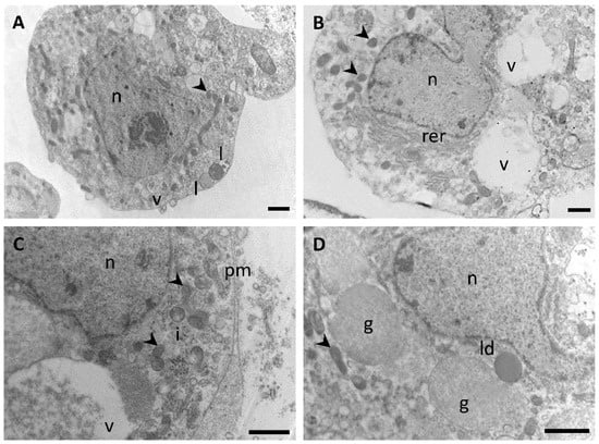 (A–D) Transmission electron microscopy of cells compatible with plasmatocytes of fifth instar nymphs of Dipetalogaster maxima. Arrowheads indicate mitochondria; n, nucleus; v, vesicles; i, inclusions; ld, lipid droplet; rer, rough endoplasmic reticulum; pm, plasma membrane; g, granules; l, lysosomes. Bars: 1 μm.