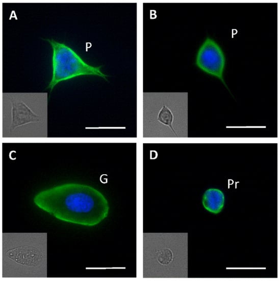 Immunofluorescence using an anti-tubulin antibody applied to monolayers of hemocytes did not allow, by itself, to unequivocally identify all cell types present in the hemolymph. Nevertheless, together with the corresponding differential interference contrast (DIC) images, it was useful to detect cells compatible with plasmatocytes, granulocytes and prohemocytes (Figure 6). The putative plasmatocytes presented several pseudopodia and a flattened surface (Figure 6A,B), while the granulocytes displayed the typical rounded to oval shape and the presence of granules of a uniform size (Figure 6C). Putative prohemocytes presented their typical rounded shape and smaller diameter when compared to other cell types (Figure 6D).