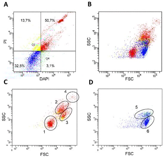 As a first attempt to employ a non-microscopy-based approach to differentiate hemolymph cell types, we used flow cytometry and the fluorescent nuclear markers PI and DAPI, which allowed to detect cells with different permeability (Figure 7). In combination with non-stained controls, the approach enabled us to differentiate four cell groups (Figure 7A, quadrants Q1–Q4). The larger one (50.7%), shown in the upper right quadrant (Q2), indicated the cells strongly stained with both markers. The percentages corresponding to the four cell groups were maintained among different biological replicates with a variation smaller than 15% (data not shown). As shown in Figure 7B–D, the cell populations were further characterized by size (FSC) and complexity (SSC), evidencing an important heterogeneity in the two larger groups displayed (Figure 7A, Q2 and Q3). In addition, based on cell size and complexity up to six cell populations could be grouped (Figure 7C,D).