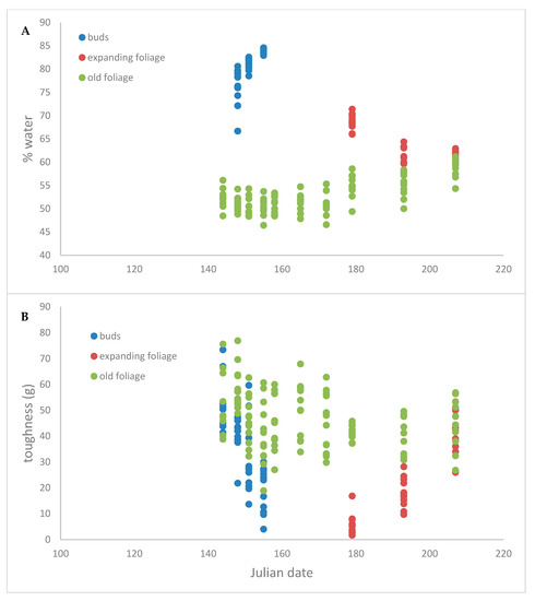 Pearson correlations showed that toughness of mature foliage decreased slightly during the season (Pearson correlation coefficient: −0.251; p = 0.006) but was not related to water content (Pearson correlation coefficient: −0.081; p = 0.37)—see Figure 2. The toughness of expanding buds also showed a negative relationship with Julian date (Pearson correlation coefficient: −0.64; p < 0.0001), and decreased with water content (Pearson correlation coefficient: −0.506; p = 0.0016) as well. Current-year leaves toughness increased as the season progressed (Pearson correlation coefficient: 0.96; p < 0.0001), but decreased with water content (Pearson correlation coefficient: −0.61; p < 0.0001).