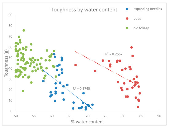 As expected, toughness of expanding foliage was inversely proportional to water content. However, water content was a poor predictor of toughness of mature foliage, and this is consistent with a previous study that links conifer toughness to fiber and particularly to hemicellulose content in balsam fir and black spruce [15]. Previous work [22] showed that water content of current-year white spruce foliage peaks soon after budbreak in mid-May as water flows in for cell expansion [26], and then steadily decreases during the shoot growth period until mid-July. Toughness of the new needles increased rapidly during the period of shoot elongation as water content dropped [22].