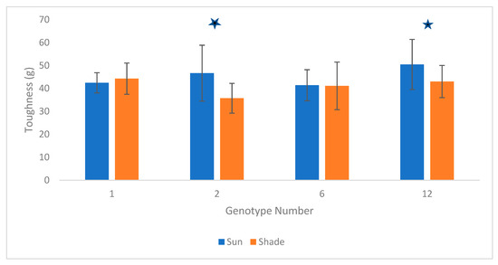 Average (+/− standard deviation) toughness of sun vs. shade leaves in four different white spruce genotypes. The numbers 1, 2, 6, and 12 represent the different genotypes of clones chosen at the Arboretum for this study. Stars indicate the two genotypes for which significant differences between sun and shade foliage were observed.
