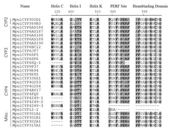 Alignment of functional domains of the 28 MpulCYPs. Conserved motifs are indicated in shadows.