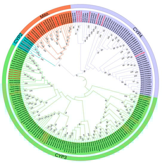 It is well known that MpulCYPs are important players in the regulation of the degradation of insecticides in insects. CYP2 clans of P450s are often involved in environmental response, and mito clans are involved in the synthesis of ecdysone [31,32]. In contrast, CYP3 and CYP4 are well known for their multiple roles in ecological adaptation in insects, such as the metabolism of exogenous toxic chemicals from the environment or hosts, participation in fatty acid hydroxylation, and biosynthesis [33]. Therefore, the number of CYP3 and CYP4 clans identified from M. pulchricornis was dramatically higher than that of the Mito and CYP2 clans.