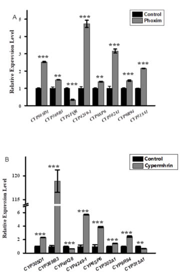 3.2. Relative Expression Profiling of P450s after Phoxim, Cypermethrin and Chlorfenapyr Treatment