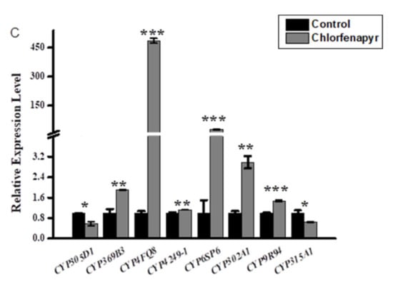 Relative expression profiles of MpulCYPs after phoxim (A), cypermethrin (B), and chlorfenapyr (C) treatment. The transcriptional level of each gene in insecticide-treated individuals was normalized relative to that in acetone-treated (control) individuals. Asterisks indicates a significant difference in relative expression levels (one-way analysis of variance with Tukey’s post hoc test, * p < 0.05; ** p < 0.01; *** p < 0.001). Log transformation was applied to satisfy the hypothesis of normality.