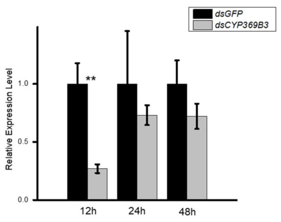 The analysis of the expression of CYP369B3 after RNAi. Differences in the expression levels of each target were compared using a t-test. Significant differences are indicated by asterisks (** p < 0.01).