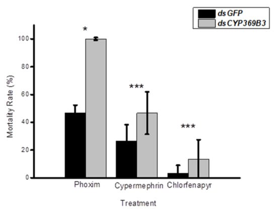 Effects of knocking down CYP369B3 on the mortality of Meteorus pulchricornis adults after treatment with insecticides. (* p < 0.05; *** p < 0.001). Square root transformation was applied to satisfy the hypothesis of normality.