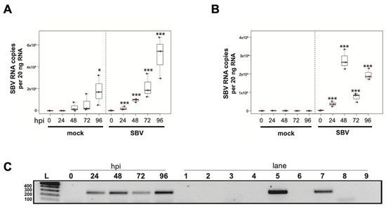 Virus-treated samples (with SBV, DWV, or FHV) were analyzed for the presence of the negative-strand RNA of the viral genome (i.e., the replicative intermediate form) using strand-specific PCR [88,179,180]. Reverse transcription/cDNA synthesis reactions were performed with M-MLV (Promega) according to the manufacturer’s instructions using negative strand-specific primers tagged with an additional 21 nt of sequence at their 5′ end (Supplemental Table S1). The tag sequence (5′GGCCGTCATGGTGGCGAATAA3′) shares no homology with the viruses used in this study nor with the honey bee genome. Reactions were carried out by incubating 100–250 ng RNA and primers (10 pmol specific or 500 ng hexamers) with 200 units M-MLV reverse-transcriptase (Promega) according to the manufacturer’s instructions. Reverse transcription reactions were incubated for 2 at 37 °C. Unincorporated primers present in the RT reactions were digested with 2 units exonuclease I (Life Technologies) per reaction at 37 °C for 30 min, followed by heat inactivation at 85 °C for 5 min. To detect negative-strand-derived cDNA products, 5 μL of cDNA template in 12.5 μL aqueous buffer containing 10 pmol of each of a tag-specific forward primer (TAGS) and virus-specific reverse primer (Table S1) was amplified with 0.5 μL (5 U/μL) ChoiceTaq polymerase (Thomas Scientific) using the following cycling conditions: 95 °C for 5 min; 95 °C for 30 s, 55 °C for 30 s, 72 °C for 45 s, 35 cycles; final elongation 72 °C for 5 min, hold at 4 °C. Negative control PCR reactions were performed using template generated from RNA-containing RT reactions that were incubated in the absence of RT enzyme or using cDNA template that was generated using random-hexamer primers and only including the reverse primer in the PCR. Positive controls included PCR using virus-specific qPCR primers (Supplemental Table S1). Viral and other long single-stranded RNA molecules often exhibit secondary structures, which serve to prime reverse transcription reactions in the absence of exogenous primers (i.e., self-priming). To test for self-priming, RT reactions were carried out in the absence of primers, followed by PCR with virus-specific qPCR primers (See Supplemental Table S1 for full list of controls).