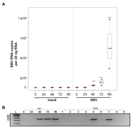 Sacbrood virus (SBV) replicates in primary honey bee pupal cell cultures. (A) SBV abundance was assessed in mock- or SBV-treated pupal cells by qPCR over a time course (i.e., 0 hpi, 24 hpi, 48 hpi, 72 hpi, and 96 hpi). A representative replicate of SBV-infection in pupal cells is plotted. The addition of larval lysate to pupal cells resulted in a 59× fold increase relative to 0 hpi by 48 hpi (p < 0.0001), with subsequent increases at 72 hpi (126×, p < 0.0001) and 96 hpi (1047×, p < 0.0001). Raw data are included in Supplemental Table S3. See Supplemental Figure S2 for additional replicates. All differences in means relative to 0 hpi were assessed by a Dunnett’s test. Significance levels: *** p < 0.0005. (B) To confirm that SBV was productive in infecting larval hemocytes, the presence of the negative strand (a replicative intermediate) was assessed by negative strand-specific reverse transcription (RT) followed by PCR. Negative strand was detected at all time points after 24 hpi. Additional control reactions were performed using pooled RNA from time points 24–96 hpi (Lanes labeled 1–9). Specifically, RNA isolated from SBV containing cell lysate was reverse-transcribed with the primer listed below, treated with Exonuclease I to remove excess primer, and amplified using the PCR primers listed for each lane. (L) Molecular weight ladder. (0, 24, 48, 96 hpi)—RT with random hexamers, PCR with SBV-221-240-For and SBV-478-497-Rev. (1) Negative control: No RT in the presence of (SBV-TAGS-F), PCR with TAGS and SBV-478-497-Rev. (2) Negative control: RT in the presence of (SBV-TAGS-F), PCR with only the SBV-478-497-Rev primer. (3) Negative control: RT with random hexamer primer, PCR with TAGS and SBV-478-497-Rev. (4) Negative control: No RT enzyme in the presence of random hexamers, PCR with SBV-221-240-For and SBV-478-497-Rev. (5) Positive control: RT with random hexamers, PCR with SBV-221-240-For and SBV-478-497-Rev. (6) Negative control: RT with random hexamers, PCR with only SBV-478-497-Rev primer. (7) Self-priming: RT without a primer, PCR with SBV-221-240-For and SBV-478-497-Rev. (8) Negative control: No template, no RT, PCR with TAGS and SBV-478-497-Rev. (9) Negative control: No template, no RT, PCR with SBV-221-240-For and SBV-478-497-Rev. Additional details provided in Supplemental Table S25.