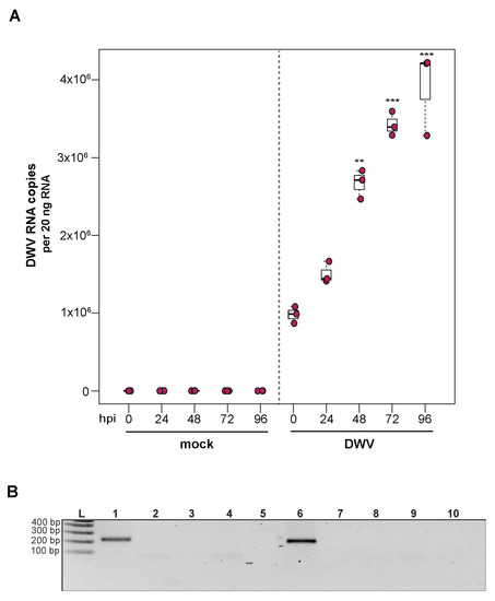 Deformed wing virus (DWV) replicates in primary honey bee pupal cell cultures. DWV abundance was assessed in mock- or DWV-infected pupal cells via qPCR over a time course (i.e., 0 hpi, 24 hpi, 48 hpi, 72 hpi, and 96 hpi). (A) Pupal cells infected with 4.3 × 106 DWV RNA copies had a 2.7× (p < 0.001) and 3.5× (p < 0.001) increase in mean DWV abundance at 48 hpi and 72 hpi, respectively, relative to 0 hpi. At 96 hpi, mean DWV abundance was 4× higher relative to 0 hpi (p < 0.001). Figure 3 includes results from one representative biological replicate. The data for additional replicates are presented in Supplemental Figure S3. All differences in means relative to 0 hpi were assessed by a Dunnett’s test. Raw data are included in Supplemental Table S4. Significance levels: ** p < 0.005; *** p < 0.0005. (B) To verify DWV replication in purple-eyed pupal cells, negative-strand-specific RT-PCR was performed, and the replicative intermediate form (i.e., negative strand) of DWV was detected at 72 hpi. Additional control reactions were performed using pooled RNA from time points 24–96 hpi (Lanes labeled 2–9). Specifically, RNA isolated DWV containing cell lysate was reverse-transcribed with the primer listed below, treated with Exonuclease I to remove excess primer, and amplified using the PCR primers listed for each lane. (L) Molecular weight ladder. (1) 72 hpi RNA template—RT with DWV-TAGS-F, PCR with TAGS and DWV-Rev. (2) Negative control: No RT in the presence of (DWV-TAGS-F), PCR with TAGS and DWV-Rev. (3) Negative control: RT in the presence of (DWV-TAGS-F), PCR with only the DWV-Rev primer. (4) Negative control: RT with random hexamer primer, PCR with TAGS and DWV-Rev. (5) Negative control: No RT enzyme in the presence of random hexamers, PCR with DWV-F and DWV-Rev. (6) Positive control: RT with random hexamers, PCR with DWV-F and DWV-Rev. (7) Negative control: RT with random hexamers, PCR with only DWV-Rev primer. (8) Self-priming: RT without a primer, PCR with DWV-F and DWV-Rev (9) Negative control: No template, no RT, PCR with TAGS and DWV-Rev. (10) Negative control: No template, no RT, PCR with DWV-F and DWV-Rev. Additional details provided in Supplemental Table S25.