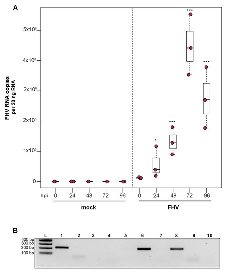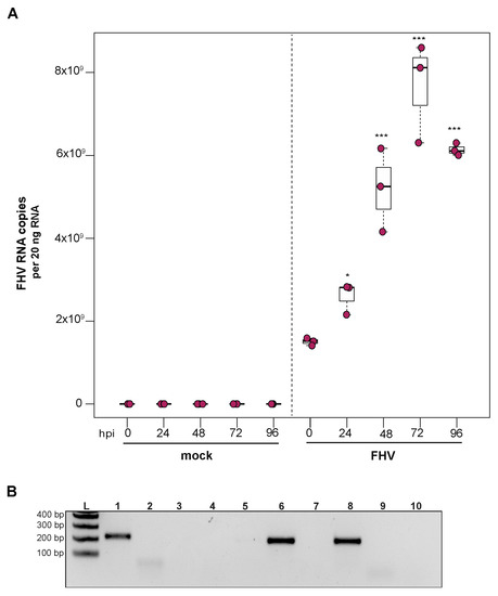 Flock House virus (FHV) replicates in primary honey bee hemocytes. FHV abundance in mock- or FHV-infected (1 × 106 FHV RNA copies) hemocytes was assessed over time (i.e., 0 hpi, 24 hpi, 48 hpi, 72 hpi, and 96 hpi). (A) FHV abundance was higher at 24 hpi (3.7×, p = 0.026), 48 hpi (10.7×, p < 0.001), and 72 hpi (37×, p < 0.001), relative to 0 hpi. FHV abundance reduced from 72 hpi to 96 hpi (p = 0.034) but was significantly higher (p < 0.001) relative to 0 hpi. Raw data are included in Supplemental Table S5. Figure 4 includes results from one representative biological replicate. The data for additional replicates are presented in Supplemental Figure S4. All differences in means relative to 0 hpi were assessed by a Dunnett’s test. Significance levels: * p < 0.005; *** p < 0.0005. (B) FHV-specific negative strand was detected at 72 hpi, which confirms that FHV productively infects primary honey bee hemocytes (Lane 1). Additional control reactions were performed using pooled RNA from time points 24–96 hpi (Lanes labeled 2–9). Specifically, RNA-isolated FHV containing cell lysate was reverse-transcribed with the primer listed below, treated with Exonuclease I to remove excess primer, and amplified using the PCR primers listed for each lane. (L) Molecular weight ladder. (1) 72 hpi RNA template—RT with FHV-TAGS-F, PCR with TAGS and FHV-Rev. (2) Negative control: No RT in the presence of (FHV-TAGS-F), PCR with TAGS and FHV-Rev. (3) Negative control: RT in the presence of (FHV-TAGS-F), PCR with only the FHV-Rev primer. (4) Negative control: RT with random hexamer primer, PCR with TAGS and FHV-Rev. (5) Negative control: No RT enzyme in the presence of random hexamers, PCR with FHV-F and FHV-Rev. (6) Positive control: RT with random hexamers, PCR with FHV-F and FHV-Rev. (7) Negative control: RT with random hexamers, PCR with only FHV-Rev primer. (8) Self-priming: RT without a primer, PCR with FHV-F and FHV-Rev. (9) Negative control: No template, no RT, PCR with TAGS and FHV-Rev. (10) Negative control: No template, no RT, PCR with FHV-F and FHV-Rev. Additional details provided in Supplemental Table S25.