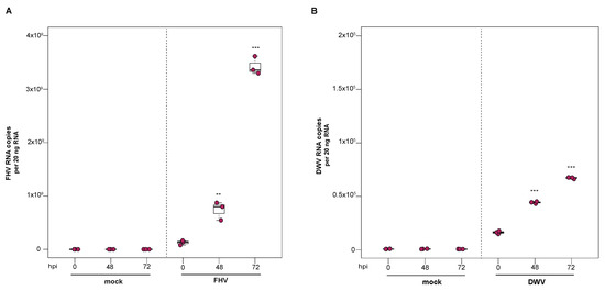 DWV and FHV infection transferred from infected to naïve honey bee pupal cells. To confirm that infectious DWV and FHV virions were produced in infected primary honey bee pupal cells, mock- or virus-infected honey bee pupal cell cultures (10 µL) at 72 hpi were transferred to naïve pupal cells. Virus abundance was assessed over a time course (i.e., 0 hpi, 48 hpi, and 72 hpi) using qPCR. Raw data are included in Supplemental Tables S7 and S8. (A) FHV abundance increased 15.8× at 48 hpi (p = 0.003), with a subsequent 28× increase at 72 hpi relative to 0 hpi (p < 0.001). (B) DWV abundance was 2.7× (p < 0.001) higher at 48 hpi and 4.1× higher at 72 hpi, relative to 0 hpi (p < 0.001). Figure 6 includes results from one representative biological replicate. The data for additional replicates are presented in Supplemental Figure S6. All differences in means relative to 0 hpi were assessed by a Dunnett’s test. Significance levels: ** p < 0.005; *** p < 0.0005.