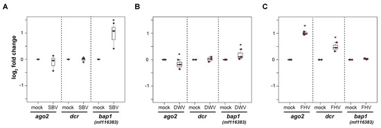 Overall, the expression of bap1 (GenBank: MF116383) was greater in SBV-infected cells than mock-infected pupal cells at 72 hpi. Specifically, in first biological replicate, bap1 expression was 0.67 log2-fold greater in SBV-infected pupal cells relative to the expression level in mock-infected cells (Wilcoxon Rank Sums, p = 0.032) (Supplemental Figure S7C). Likewise, bap1 expression was greater in the second biological replication (0.95 log2-fold, p = 0.032, Figure 7A) but not the third. Since the bap1 expression was greater two of the three biological replicates of SBV-infected pupal cells, its expression in the third biological replicate was also assessed at 96 hpi, at which time its expression was 0.73 log2-fold higher in SBV-infected cells relative to mock-infected cells (p = 0.032) (Supplemental Figure S7C). Expression of neither ago2 nor dcr-like were appreciably impacted by SBV infection. Specifically, ago2 was not differentially expressed in the first two replicates but had −0.76 log2-fold lower expression in the third replicate (p = 0.032) (Figure 7A and Figure S7A). Similarly, dcr-like was not differentially expressed in the second replicate but exhibited −0.67 log2-fold lower expression in the third replicate (p = 0.032) (Supplemental Figure S7). In DWV-infected pupal cells, bap1 expression was unchanged in one replicate (Supplemental Figure S8C) and slightly greater in the second experimental replicate relative to mock-infected cells at 72 hpi (0.18 log2-fold change, p = 0.032, Figure 7B). In DWV-infected pupal cells, ago2 expression was slightly lower compared to mock-infected cells in two biological replicates (−0.28 and −0.18 log2-fold change, p = 0.032, Figure 7B and Figure S8A). In contrast, dcr-like expression was slightly lower in DWV-infected pupal cells in one replicate (−0.26 log2-fold, p = 0.032, Figure S8B), while its expression was similar to mock-infected cells in another replicate (Supplemental Figure S7B). The expression of bap1 was not appreciably impacted by FHV infection of pupal cells (Figure 7C and Figure S9C). Specifically, bap1 expression was slightly lower in one replicate (−0.4 log2-fold, p = 0.032) and unchanged in the second replicate, compared to mock-infected cells (Figure 7C and Figure S9C). Interestingly, ago2 expression was consistently higher in FHV-infected cells relative to mock-infected cells in two replicates (i.e., 1 log2-fold in rep1 and 1 log2-fold in rep2, p = 0.032) (Figure 7C and Figure S9A). Similarly, dcr-like expression was greater in FHV-infected cells relative to mock-infected cells in both replicates (i.e., 0.66 log2-fold in rep1 and 0.48 log2-fold in rep2, p = 0.032) (Figure 7C and Figure S9B). The trends in immune gene expression in FHV-infected hemocytes were similar to FHV-infected pupal cells (Supplemental Figure S10). Specifically, bap1 expression was similar in FHV-infected and mock-infected cells at 72 hpi, whereas FHV-infected hemocytes exhibited greater ago2 (i.e., 1.1 log2-fold in rep1 and 0.54 log2-fold in rep2, p = 0.032) and dcr-like expression (i.e., 0.45 log2-fold in rep1 and 0.63 log2-fold in rep2, p = 0.032) than mock-infected hemocytes in both biological replicates (Supplemental Figure S10).