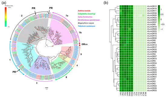 In total, 38 putative OR-encoding unigenes (AtumOR1-38) were identified based on the combined transcriptome data from A. tumida (Supplementary Table S2: Sheet 1). Of these, 19 unigenes encode the full-length proteins of 300–400 amino acids with 2–8 transmembrane domains (TMDs). Meanwhile, five AtumORs (AtumOR1, 2, 7, 35 and 36) encoded seven-TMDs (see Supplementary Table S2: Sheet 1). Furthermore, we identified an OR gene (AtumOR1) had a high sequence homology with the conserved insect Orco gene family and named it AtumOrco. In previous studies, phylogenetic analysis has separated ORs in Coleopteran species apart from the Orco gene subgroup (which includes AtumOrco, CbowOrco, DponOrco and TcasOrco), into multiple subgroups numbered 1–7 [39,40] (Figure 1a). Following the maximum-likelihood phylogenetic analysis, except two AtumORs (AtumOR8 and 26), 36 ORs were divided into six subgroups (group 1–5, and 7), with six ORs assigned to group 1, eight ORs assigned to group 2, six ORs assigned to group 3, two ORs assigned to group 4, two ORs assigned to group 5, and 11 sequences assigned to group 7, respectively. Group 7 was further assorted into two subsets: group 7a and group 7b. The rest one subgroup 6 contained only T. castaneum ORs. No AtumORs were clustered with high homology to known functional ORs, such as pheromone receptors from M. caryae [40].