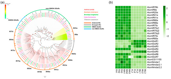 Twenty-four putative iGluR/IR-encoding genes were identified (Supplementary Table S2: Sheet 2). Among them, 23 iGluRs/IRs had full-length ORFs, with at least 369 amino acid residues. All putative proteins contained at least a ligand binding domain (LBD) or a Lig_Chan domain, which are characteristics of most insect IRs. According to the phylogenetic analysis of iGluRs/IRs from five Coleopteran species, all the identified iGluRs/IRs can be classified into different subgroups, including (N-Methyl-D-aspartic acid) NMDA iGluRs, non-NMDA iGluRs, antennal IRs, and divergent IRs (Figure 2a). A group of “antennal IR” conserved among Coleopterans was also observed. Thirteen AtumIRs, including AtumIR8a, 21a, 25a, 41a, 60a, 68a, 75c, 75q1, 75q2, 75q3, 75s, 76b, and 93a, were clustered with their orthologs. Genes encoding all antennal IRs from A. tumida were expressed at relatively high levels in both FA and MA. In comparison, genes encoding a number of non-NMDA iGluRs (AtumGluR1, 2, 3, 5, and 7) were expressed at higher levels in FL and ML (Figure 2b). The gene encoding the co-receptor AtumIR76b had the highest expression (FA: 114.3, MA: 108.1, mean FPKM) among all antennal IRs of the small hive beetle, followed by AtumIR8a (FA: 42.5, MA: 41.9, mean FPKM) and AtumIR25a (FA: 23.2, MA: 21.8, mean FPKM) (Supplementary Table S4).